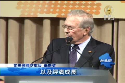 【新唐人亞太台2011年10月12日訊】前美國國防部長倫斯斐星期二在台灣的演說,吸引眾多學者與官員到場。當提到中國問題時,倫斯斐表示,外界曾希望,自由經濟可以促進中共政治開放,但最後證明這只是幻想。倫斯斐還說,共產國家的人民在受苦受難,箝制久了人民會起而反抗。