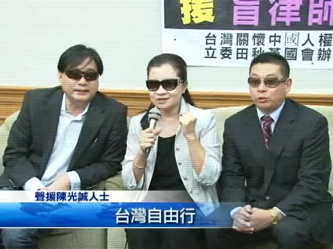 【新唐人2011年10月16日訊】中國維權律師不斷受打壓,今天立法委員與海外民運人士共同發起「台灣光誠行動」,希望在江陳會召開前夕,總統馬英九和兩會談判代表,能要求中共,釋放被軟禁的盲人律師陳光誠,表態聲援中國人權。