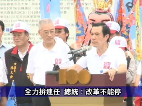 總統馬英九週六(10/15)在臺中市造勢晚會中表示,中國國民黨以實際執政成果證明4年前取代民主進步黨是正確的。馬總統與國民黨副總統參選人吳敦義首場與立法委員的聯合大型造勢晚會選在臺中市大裡運動公園舉行,現場支持者超過1萬人。