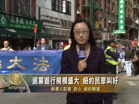 觀眾朋友,我現在就站在紐約歷史最悠久的唐人街上,慶祝一億勇士退出中共的大遊行就在這裡舉行,讓我們一起看看遊行的盛況。