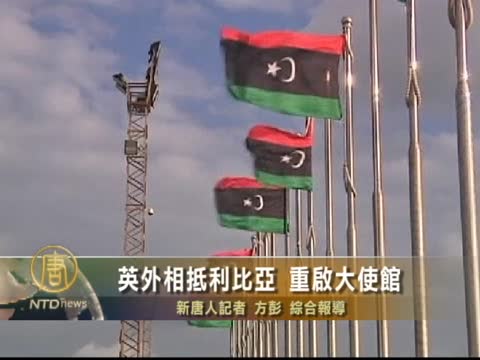 【新唐人2011年10月17日訊】星期一,英國外交大臣黑格抵達的黎波里正式重啟英國駐利比亞使館,黑格表示英國將採取進一步措施,保障利比亞人安全與穩定。他並表達對 “過渡委”部隊人道處置卡扎菲軍隊的關切。