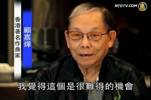 顧嘉煇得知新唐人全世界華人聲樂大賽在紐約的卡內基音樂廳舉行,感到非常高興,稱讚大賽是音樂界非常好的交流平臺,呼籲聲樂界千萬別錯過機會。