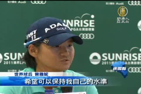【新唐人亞太台2011年10月20日訊】鏡頭轉回台灣,台灣史上第一場世界級的LPGA台灣巡迴賽今天(20)正式開打了, 世界球后曾雅妮回到故鄉打球,台灣球迷全力相挺,而曾雅妮也不負眾望,今天在最後第18洞時即時抓下1個博蒂(Birdie),以低於標準桿4桿的總桿68桿成績, 與日本好手宮里藍暫時並列第一。