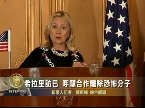 【新唐人2011年10月21日訊】正在巴基斯坦訪問的美國國務卿希拉里‧克林頓星期五(10月21日)在伊斯蘭堡舉行新聞發佈會,呼籲巴基斯坦與美國之間加強合作,以驅除該地區的恐怖份子。