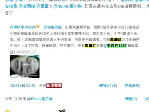 網友「老百姓1987」在新浪微博發文稱山東利津縣馬繼紅已懷胎6個月,10月12日被計生辦人員10多人強制引產致一屍兩命。死者家屬指出,從事情發生到現在,醫院還有計生辦領導、工作人員都沒出面。