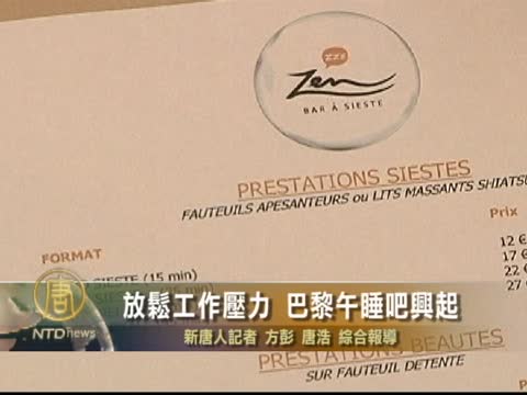 【新唐人2011年10月22日訊】每天上班到中午,你會不會午休一下呢?在法國巴黎,越來越多的上班族會在中午前往「午睡吧」(bar a sieste) 好好休息片刻,讓自己好好放鬆、充電。究竟甚麼是「午睡吧」呢?讓我們帶您去了解。