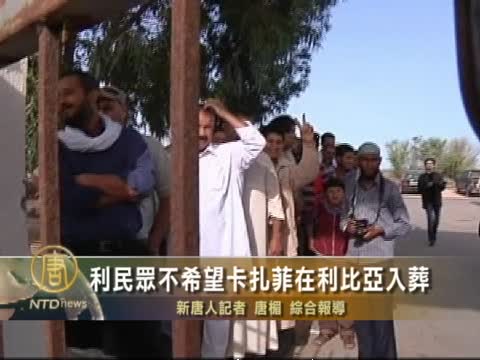 【新唐人2011年10月24日訊】在完成驗屍後,利比亞獨裁者卡扎菲的屍體星期天被送回米蘇拉塔一個菜市場的冰庫。當地的男女老少排隊爭睹獨裁者的最後下場。民眾提到希望以穆斯林傳統埋葬卡扎菲,但也表示想到他的罪行、不應該讓他葬在利比亞。
