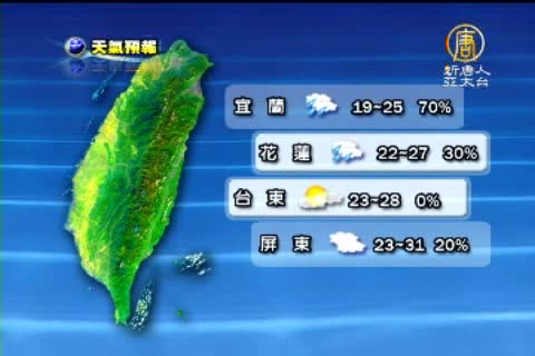 【新唐人亞太台2011年10月26日訊】來關心天氣,氣象局表示,星期四(27)日起東北季風威力會逐漸減弱,氣溫也會緩步回升,除了北部、東北部還會有短暫陣雨外,其餘地區都是晴到多雲的天氣型態,白天南部高溫將回溫到30度,北部約在25度。以下帶您關心10月27號星期四的天氣預報。