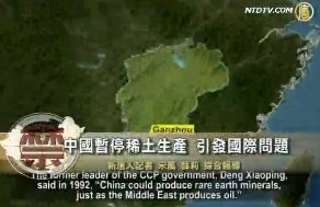 【新唐人2011年10月28日訊】稀土是現代許多科技產品的關鍵原材料,中國稀土總產量佔世界稀土產量的95%。近幾個月,國際市場上稀土價格下跌了約20%。中國稀土產量占統治地位的兩大公司決定暫停生產,意圖提高十七種稀土的市場價格,這引起很多國家感到不滿。