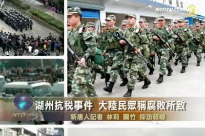 【新唐人2011年10月28日訊】浙江湖州織里鎮抗稅事件引發的暴動,到了27號下午稍有平息,織里鎮街頭到處是警察,甚至連各式裝甲車都開上了街頭;當地民眾表示,政府貪污腐敗嚴重,是爆發這起事件的根本原因。
