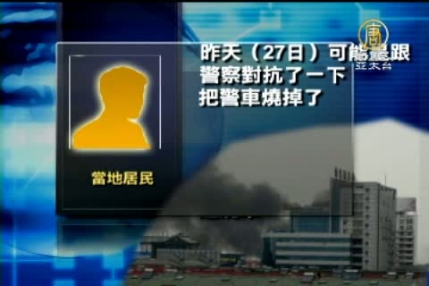 【新唐人亞太台2011年10月28日訊】浙江湖州市織里鎮27號晚上全城戒嚴,政府從江蘇、上海等多地增調大批防暴特警,還從南京軍區調來部隊駐紮,但仍然有警車被掀翻及燒燬,官方表示目前已經抓捕28人,否認有人死亡,不過民眾表示肯定有死傷。