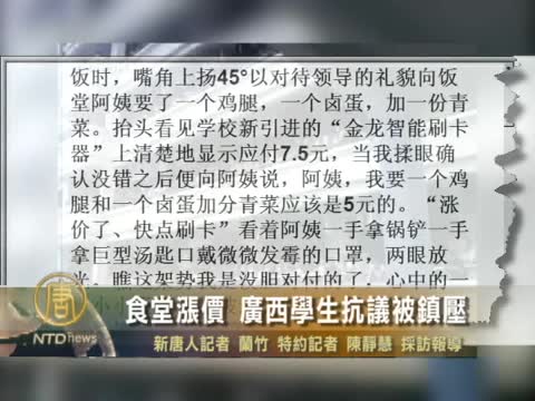 中國廣西岑溪市第三中學,週三發生大批學生聚集在學校新落成的食堂外,高聲抗議學校大幅提高飯菜價格﹔學生曾在百度網吧披露,到學校新餐廳吃飯,點了雞腿、青菜及滷蛋,刷卡器上明顯顯示應付7.5元,而這原來只要人民幣5元。(圖2)(視頻)