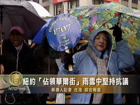 【新唐人2011年10月30日訊】紐約的雨雪沒有讓“佔領華爾街”運動的抗議者回家。星期六(10月29號),他們繼續在街頭呼籲,實現經濟的平等。