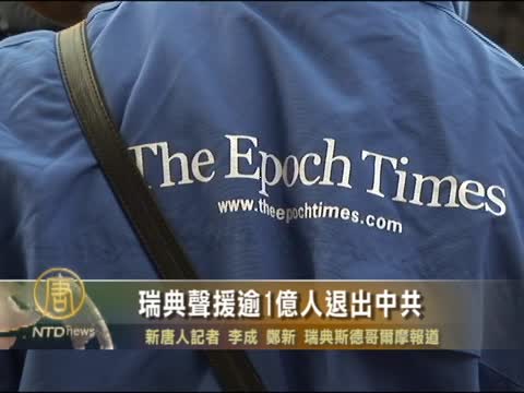 【新唐人2011年10月30日訊】據大紀元網站統計,全球退出中共黨、團、隊的人數已於2011年8月6日突破了1億人。這是一個具有里程碑意義的歷史紀念日,為了讓更多的人了解事實真相,瑞典退黨服務中心和大紀元時報在瑞典首都斯德哥爾摩聯合舉辦集會進行聲援,下面請看來自當地的報導。