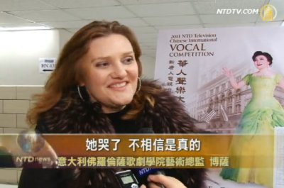 【新唐人2011年10月30日訊】專程從意大利趕來的佛羅倫薩歌劇學院藝術總監博薩女士和西西里音樂學院院長格魯索先生,在觀看了新唐人聲樂大賽的複賽之後,對選手的表現相當肯定,並擬定名單,邀請選手去意大利參加大師班和音樂會。請看報導。