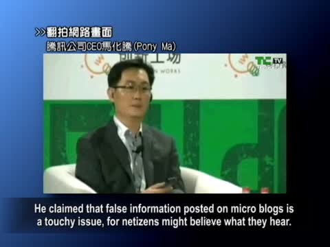 週一(31日)騰訊公司(Tencent)CEO馬化騰(Pony Ma)出席北京舉辦的科技博客大會﹙TechCrunch Disrupt﹚時表示,正在研究新的方法監控騰訊微博上的內容,他說,公司對出現在微博上的虛假信息感到棘手,網絡用戶可能認為這些虛假信息是真的。
