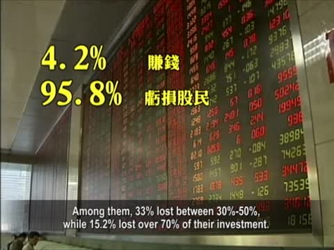 據《鳳凰網》股票頻道隨機調查發現,今年來僅有4.2%的股民是在賺錢,帳戶虧損的股民佔到95.8%。其中,虧損在30%-50%的股民佔到33%,虧損超過70%的股民更是達到15.2%。6成網民表示,即使割肉也要退市;24%的網民表示,等行情轉好後賺了錢再退市。
