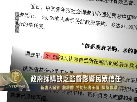 【新唐人2011年11月2日訊】最近,中國一項調查顯示,多達97.9%的人表示,政府採購亂象會影響自己對政府的信任度。致力於政府採購研究的大陸學者徐煥東指出,防範政府採購亂象,應該加強公共監督。