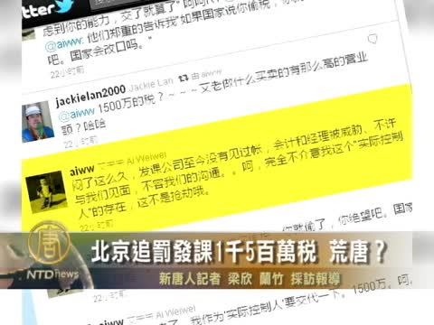 【新唐人2011年11月2日訊】艾未未和他的妻子發課公司法人代表路青,週二接到北京地稅局1千5百22萬元人民幣的追稅及罰款單。但,艾未未指,公司至今沒有看到帳本,處罰像搶錢。目前,律師已介入了解,將適時採取法律途徑。