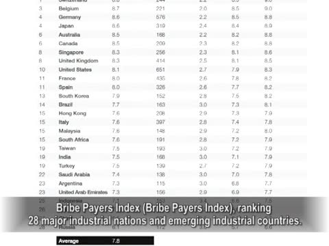 總部設在德國柏林的「國際透明」組織,11月2號公布的2011年度「行賄指數」(Bribe Payers Index),將世界上28個主要工業國家和新興工業國家納入考察範圍。他們對3000名企業經理人員就「是否願意通過對外國官員行賄,來獲得業務上的好處」 進行了問卷調查,根據回答他們給這28個國家的企業分別打出分數,滿分為十分,就是「從不行賄」。
