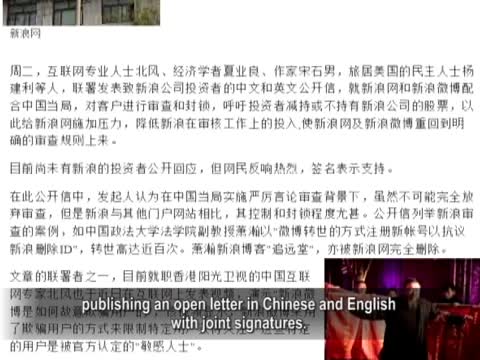 【新唐人2011年11月5日訊】新浪網配合中共官方,對用戶進行言論審查和封鎖。多位專家、學者和作家等人近期聯署公開信給新浪公司的投資者,希望投資者,減持或不持有新浪公司的股票,以降低新浪的審核成本投入,恢復對大陸網民的信息平臺。對此,有關人士認為,批評新浪是應該的,更應該批評的是管新浪微博的人。