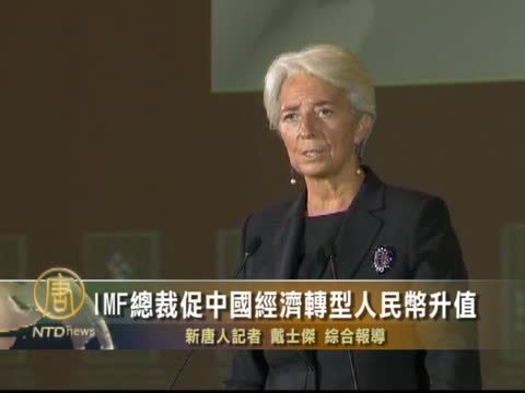 【新唐人2011年11月9日訊】國際貨幣基金組織總裁拉加德(Christine Lagarde)星期三(11月9日)表示,中國經濟應轉向國內消費驅動,並敦促人民幣需「切合實際」的升值。