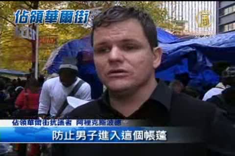 佔領華爾街的抗議者阿裡克斯‧波德:「女性帳蓬裡只住女士,帳蓬外面和裡面都有義工看守,防止男子進入這個帳蓬。」