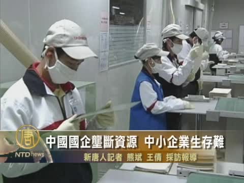 【新唐人2011年11月12日訊】中國國有企業壟斷絕大部分的資源,中小企業面臨來自國有企業的不公平競爭,生存受到嚴重挑戰。大陸學者指出,政府控制了整個社會資源,加上政府的各種的刁難,如收費啊,過多的稅收等,壓縮了民營中小企業的生存空間。