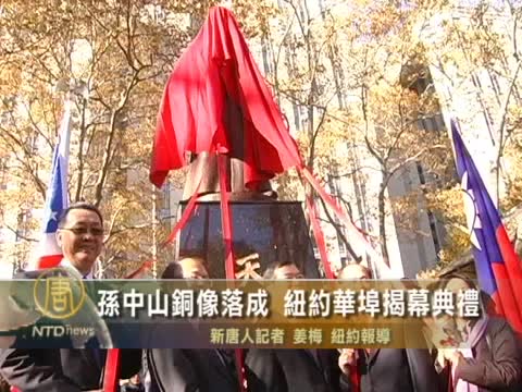 【新唐人2011年11月13日訊】今天是11月12日,也是孫中山先生誕辰145週年紀念日,紐約中華公所為孫中山銅像座落華埠哥倫布公園舉行了隆重的揭幕典禮和獻花儀式,中華民國僑務委員會委員長吳英毅,經文處處長高振群,中華公所主席伍權碩等嘉賓為銅像剪綵,上千名民眾觀看揭幕儀式。