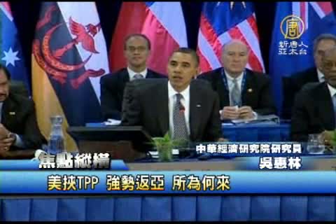 【新唐人亞太台2011年11月16日訊】從剛剛的新聞,我們要來告訴您,美國挾著強勢的TPP,重返亞洲,其實,美國希望重新參與亞洲事務,並不令人意外。因為,就像是美國總統歐巴馬自己講過,亞洲是一個大有作為的地區。亞洲地區的平均增長率在7%以上,那麼隨著歐洲陷入危機和國內增長乏力,美國希望利用亞洲市場,來實現歐巴馬出口翻倍和創造就業的目標。怎麼更進一步的看待美國的舉動?這對中國將會有什麼樣的牽制作用?我們今天的焦點縱橫,為您深度探討。