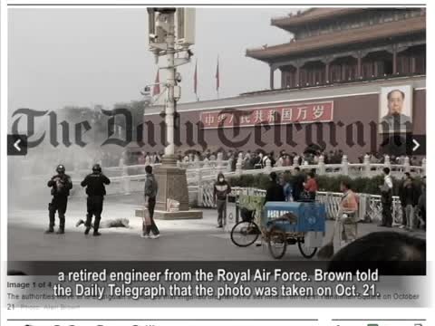 英國《每日電訊報》,在頭版刊出這張駭人的照片。這張照片是由英國皇家空軍退休工程師布朗提供的。布朗對《每日電訊報》表示,這起天安門前自焚事件發生在10月21號,自焚的人就在他面前2、3百公尺,他在放火自焚前曾高聲喊話。當時在場的有數百人,其中不少人還拿著相機拍攝,可令人感到震驚的是,這一極為罕見的悲劇性事件,卻沒有被任何媒體提起,也沒有在互聯網論壇、博客、微博等出現過,似乎根本就沒發生過。