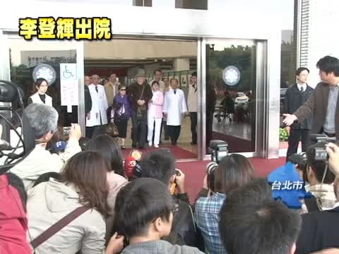 【新唐人2011年11月19日訊】前總統李登輝,這個月一號,因為大腸癌手術開刀,住院17天,今天(11/18 )正式出院。他在夫人曾文惠與榮總正副院長的陪同攙扶下,緩慢步行出院門,露出微笑,感謝大家關心。