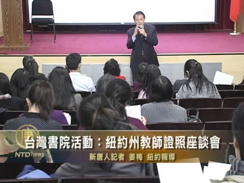 【新唐人2011年11月19日訊】駐紐約臺北經文處文化組舉辦的台灣書院系列活動:紐約州教師證照座談會今天(11月18號)下午在經文處視聽會議室舉辦,邀請教育局專業人士講解雙語學生服務計劃以及教師證照的政策現況,請看報導。