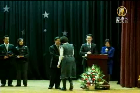 下午,總裁李琮在工作報告中敘述了未來的發展規劃,並表彰了長期為新唐人默默奉獻的員工。