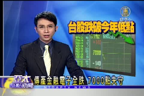 【新唐人亞太台2011年11月23日訊】受到歐債美債影響,台股連日重挫,在政府政策強力作多以及基金進場護盤之後,驚險守住7000關卡,不過23日持續弱勢表現,在傳統產業、金融及電子類股全面走跌下,大盤指數開低震盪走低,7000點關卡失守,甚至一度摜破6900點。受到台股拖累,新台幣一路走貶,盤初以30.31元貶值0.1分開出,盤中一度貶值5分,這波股匯能不能hold的住,還得看國際情勢能不能止跌回升。