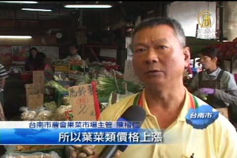 【新唐人亞太台2011年11月23日訊】歡迎回到新聞現場。每年秋冬中南部進入旱季,幾乎不下雨,但是今年從11月8號開始,受鋒面及東北季風影響,引發全台局部性大雨;農委會估計全臺農業產物損失6億3千零54 萬元,菜價應聲上漲。尤其是葉菜類受影響較大,台南地區有些葉菜類甚至連漲3倍 。