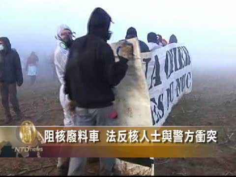 【新唐人2011年11月23日訊】星期三(11月23日),法國一輛運送核廢料到德國的堆放場的列車在啟程前,遭到反核人士的抗議。