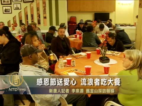 【新唐人2011年11月25日訊】感恩節到來,慈善機構Cityteam在舊金山特別為無家可歸的流浪者準備了豐美的食物,邀請他們共度節日的美好時光,請看本臺記者發自舊金山的報導。