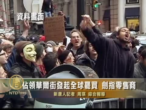 【新唐人2011年11月25日訊】“佔領華爾街”運動的示威者將矛頭指向新的目標—大型零售商。他們發起“全球罷買日”以及“佔領黑色星期五”等活動,呼籲大眾在感恩節後的“黑色星期五”拒絕購買大型零售商貨品。