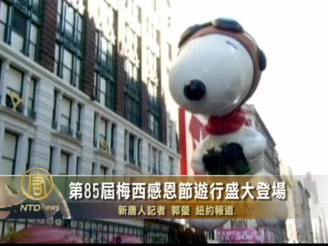 【新唐人2011年11月25日訊】11月24日是感恩節,歡樂的氣氛充滿了美國的大街小巷,不可錯過的莫過於是紐約的梅西百貨感恩節大遊行,今年已經是第85屆,不僅是紐約的傳統,更成了觀光特色之一,下面就跟隨我們的記者去感受一下遊行的盛況。