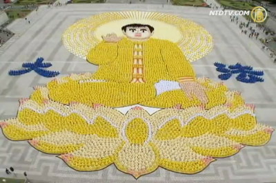 從十層樓高的吊臂俯拍,七千四百名法輪功學員的排字巨圖壯觀呈現,八種顏色,整齊的微粒,要在長寬120米的空間中,表現出法輪功創始人的法像。