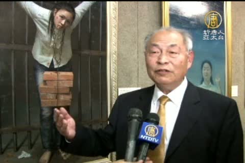 大賽評委主席 張崑崙:「這種形式,你看她的手吊在那個地方,讓人一看馬上想到的就是當年耶穌被釘在十字架上。耶穌是為什麼被釘在十字架上呢?因為耶穌他是在為民受苦,人們馬上就會想到,法輪功學員為什麼被抓、被打,甚至被活摘器官、生命被殘殺,他還要這樣去做呢?他要用他的痛苦的承受,去喚醒人們的良知。」