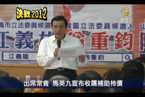 【新唐人亞太台2011年11月30日訊】柿子價格爭議,轉變為總統選舉藍綠攻防焦點。今天(30日)國民黨行動中常會,移師嘉義舉行,話題依舊圍繞農產品。針對近來柿價偏低,農民血本無歸,總統 馬英九也在會中宣布,將由中央補助120萬,以每公斤五元,收購牛心柿次級品,要全面穩定柿子的價格。不過民進黨也回應,中央至今才宣布要補助農民,不僅慢半拍,還把責任推卸給地方政府。