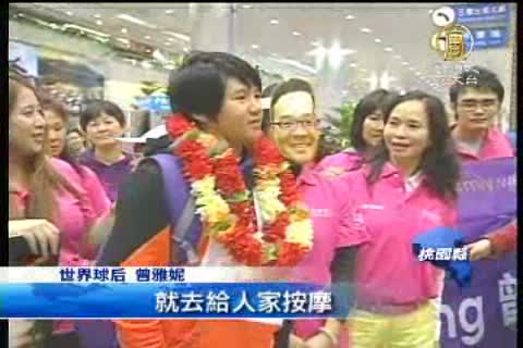 台灣世界球后曾雅妮,帶著招牌笑容返回台灣,她穿著帽T和運動褲,打扮十分輕鬆休閒,入關時她一路展現平易近人的球后風采,在桃園機場受到球迷和裙襬搖搖高球隊的熱烈歡迎。