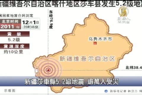 【新唐人亞太台2011年12月2日訊】為您報導我們收到的消息,大陸新疆喀什地區莎車縣,當地時間12月1日晚上8點48分,發生芮氏規模5.2地震,震源深度10公里。