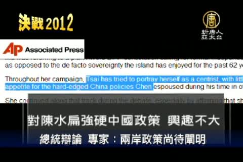 【新唐人亞太台2011年12月4日訊】新聞頭條,馬上帶您聚焦2012總統大選的消息,首次總統大選電視辯論引發矚目,美日媒體聚焦兩岸話題,不過,專家指出,雖然雙英這次就台灣共識與九二共識作攻防,但關鍵的兩岸關係戰略,還是沒列為重點,也就是雙方都在摸底階段。