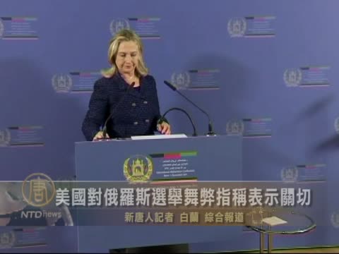 【新唐人2011年12月6日訊】俄羅斯議會選舉在星期一清點了96%的選票後,普京執政的統一俄羅斯黨預計將贏得國家杜馬,來自歐洲安全與合作組織的選舉觀察員們星期一報告說,選舉中出現了許多違規行為,都傾向於統一俄羅斯黨。美國國務卿希拉里•克林頓當天對此表示嚴重關切。