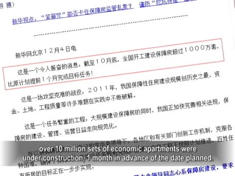 《新華網》12月4號報導,截至今年10月底,全國開工建設保障房超過1000萬套,比原計劃提前1個月完成目標任務。《新華網》說,中華大地上,迅速掀起了推進保障房建設的熱潮。