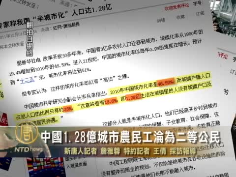 【新唐人2011年12月6日訊】中國1.28億農民工在城市就業和生活,卻沒有城市戶口,享受不到市民的待遇,政府不願給他們教育、醫療、住房、社會保障,淪為二等公民,大陸學者指出,湧入城市的新生代農村人口越來越多,戶籍登記應該隨著工作居住地而遷移,與城市居民享有同等待遇。