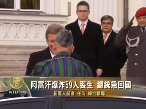 【新唐人2011年12月7日訊】星期二(12月6號),阿富汗首都和北部城市分別發生兩起炸彈襲擊事件,造成至少59人死亡,160多人受傷。當天,正在德國波恩出席阿富汗國際會議的阿富汗總統卡爾扎伊,臨時取消了訪問英國的計劃,提前回國。